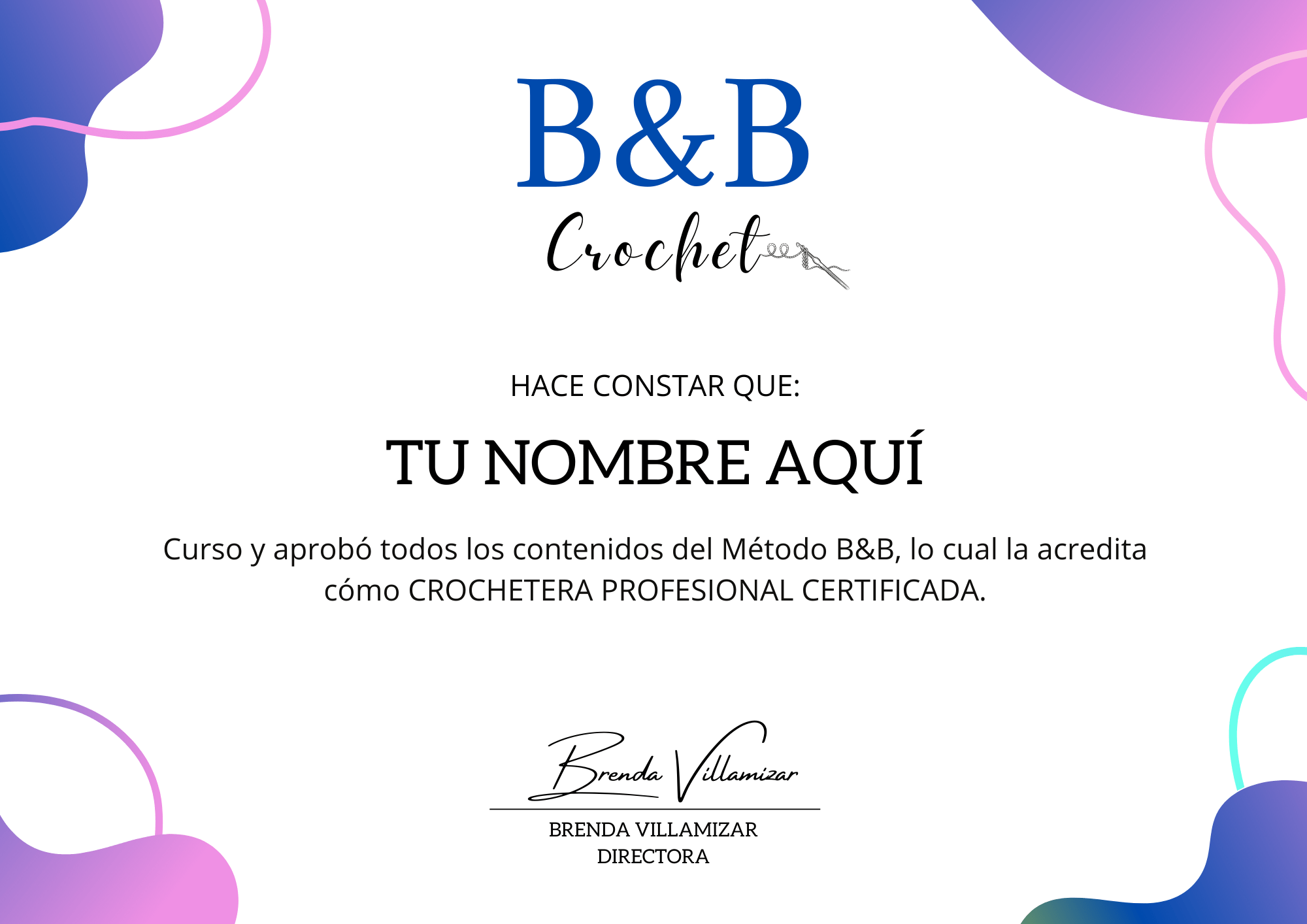 EL MÉTODO B&B ES EL ÚNICO PROGRAMA PROFESIONAL DE CROCHET EN ESPAÑOL QUE TE ENTREGA UN CERTIFICADO UNIVERSITARIO VÁLIDO EN TODOS LOS PAÍSES AL FINALIZAR EL PROGRAMA.